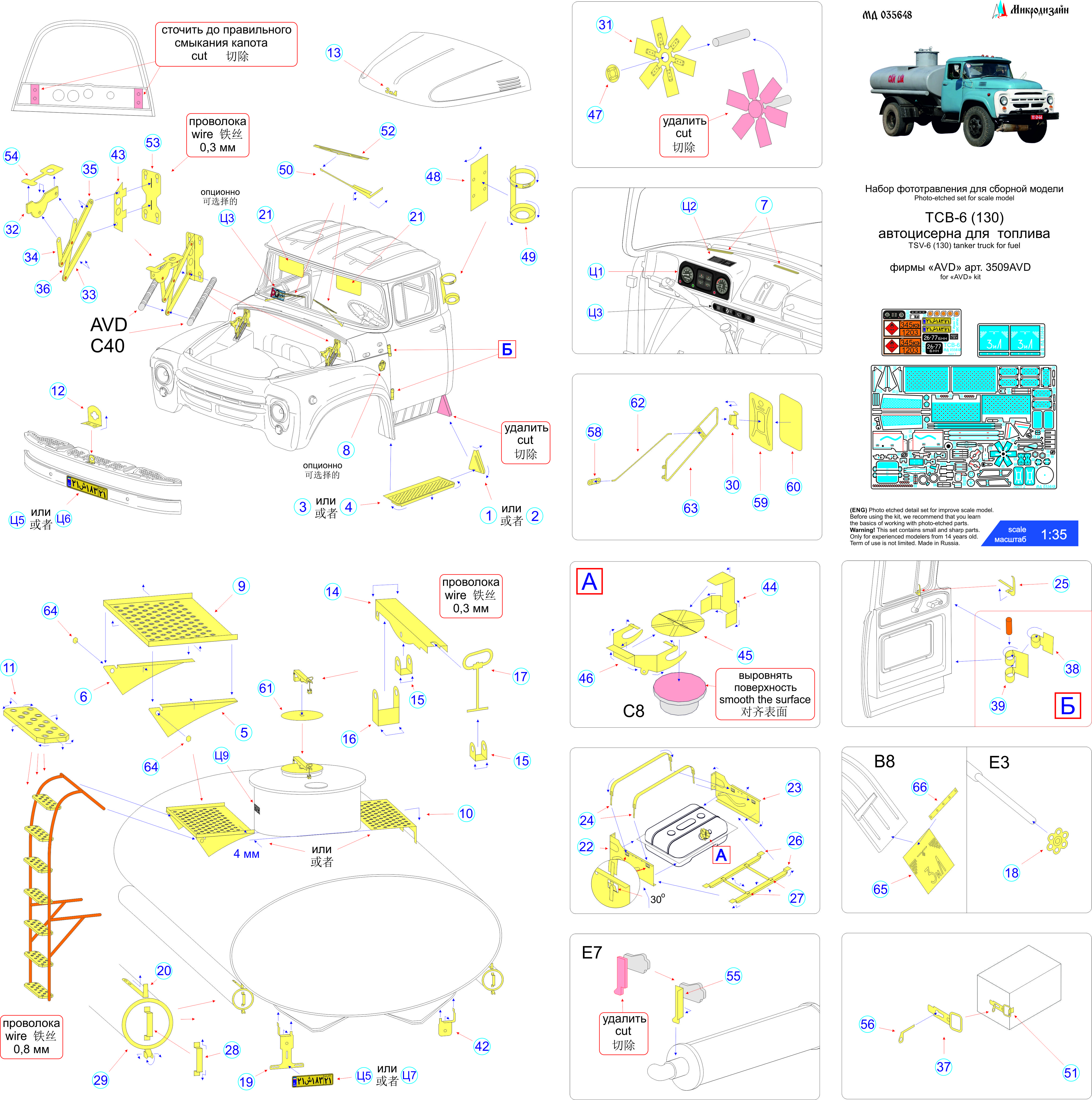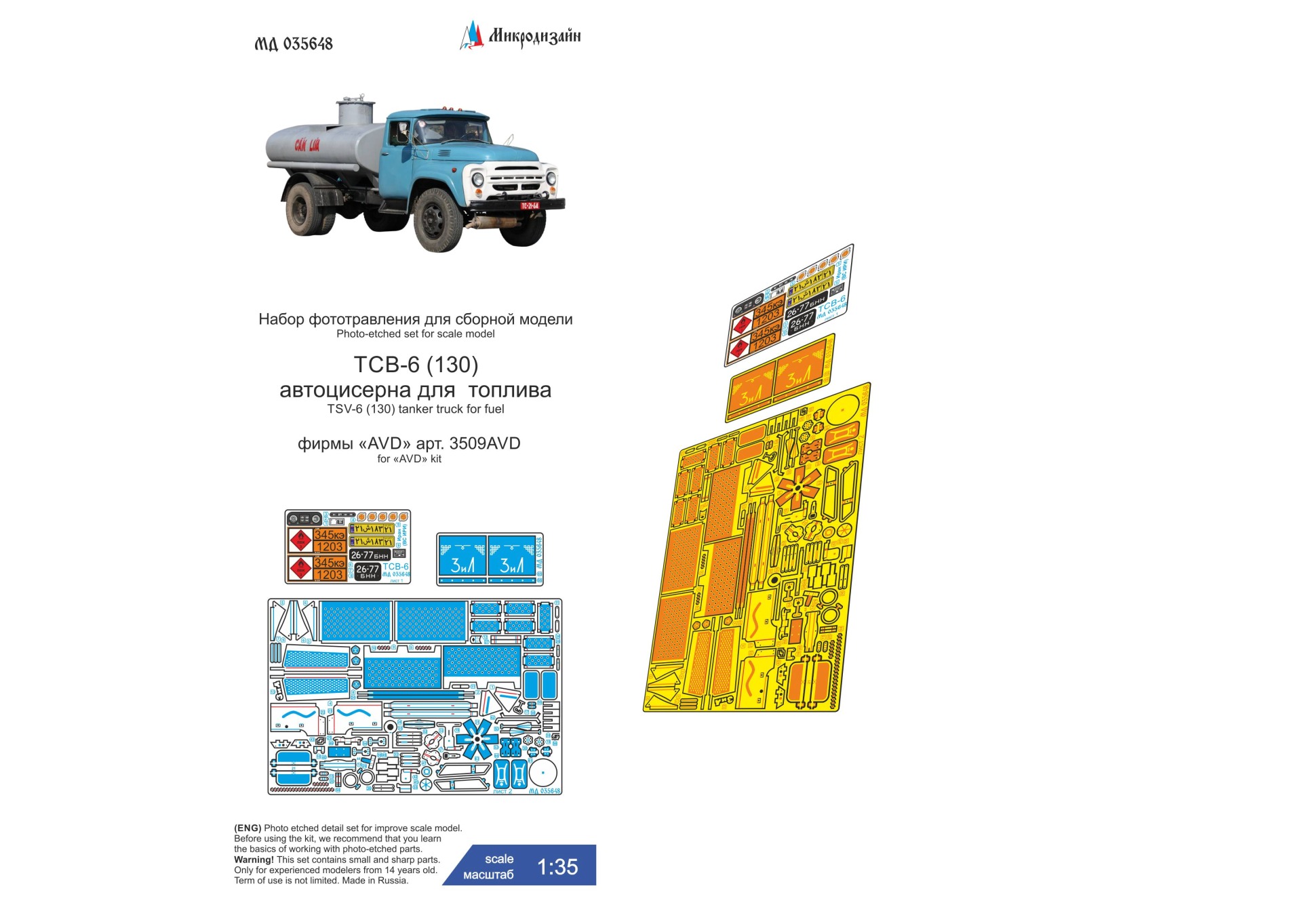 МД 035648 Набор фототравления для сборной модели ТВС-6 от AVD. Масштаб 1:35. Материал: латунь 0,15 мм. Набор комплектуется 3 пластинами фототравления (в том числе цветными объёмными приборными досками) и полноцветной инструкцией. Количество уникальных деталей: 66 шт. Уровень сложности - средний.