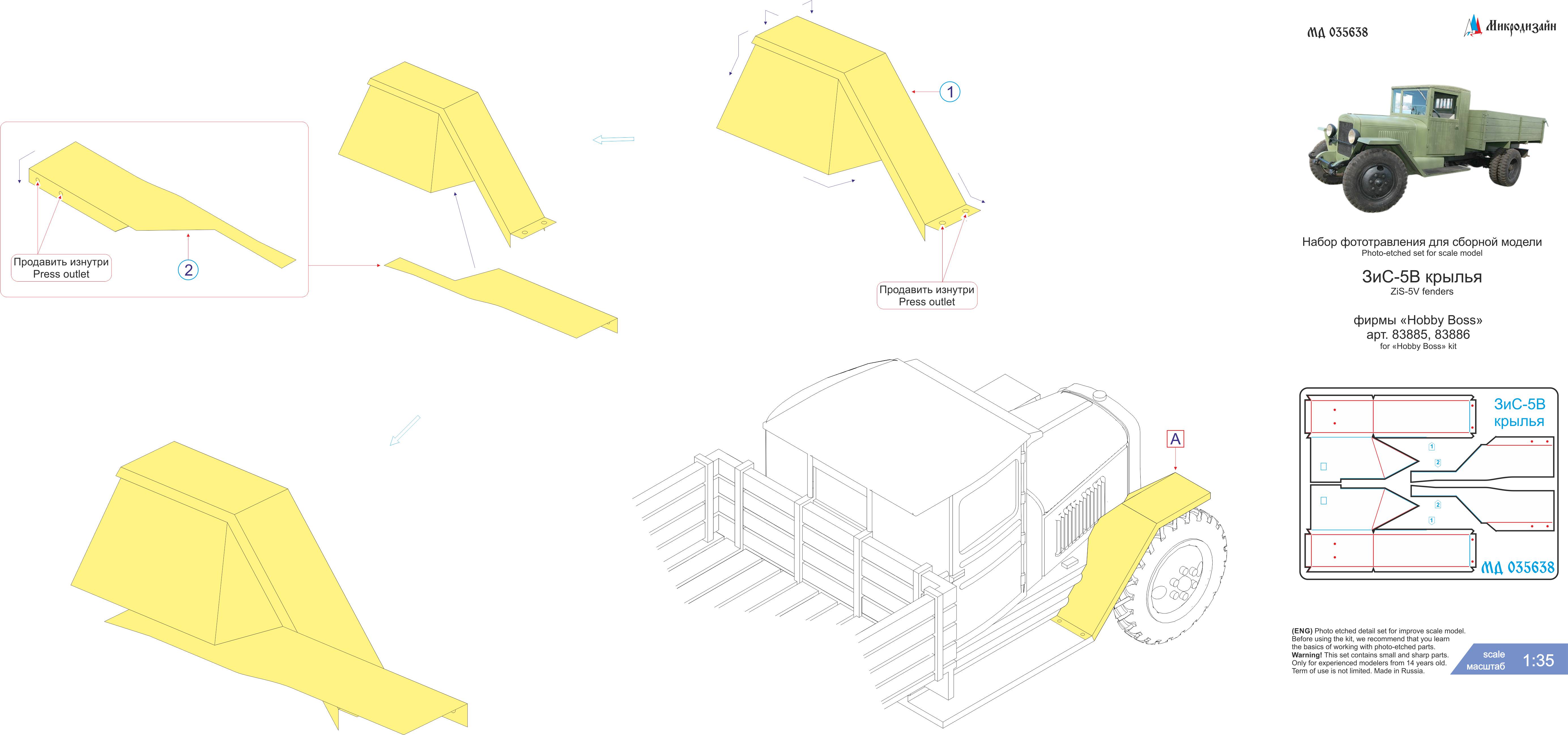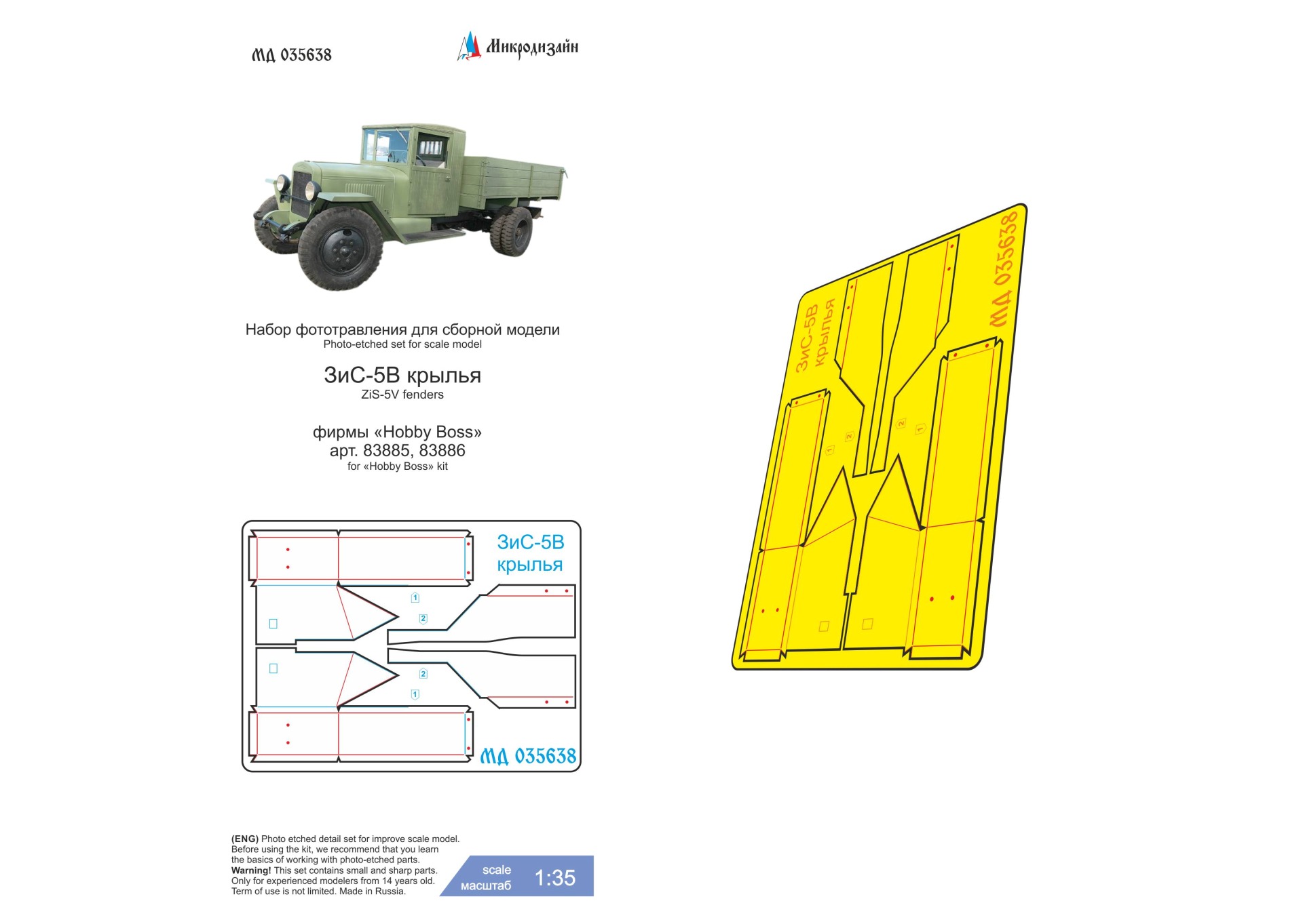 МД 035638 Набор фототравления крыльев для сборной модели ЗиС-5В от Hobby Boss. Масштаб 1:35. Материал: латунь 0,2 мм. Набор комплектуется пластиной фототравления и полноцветной инструкцией. Количество уникальных деталей: 2 шт. Уровень сложности - средний.