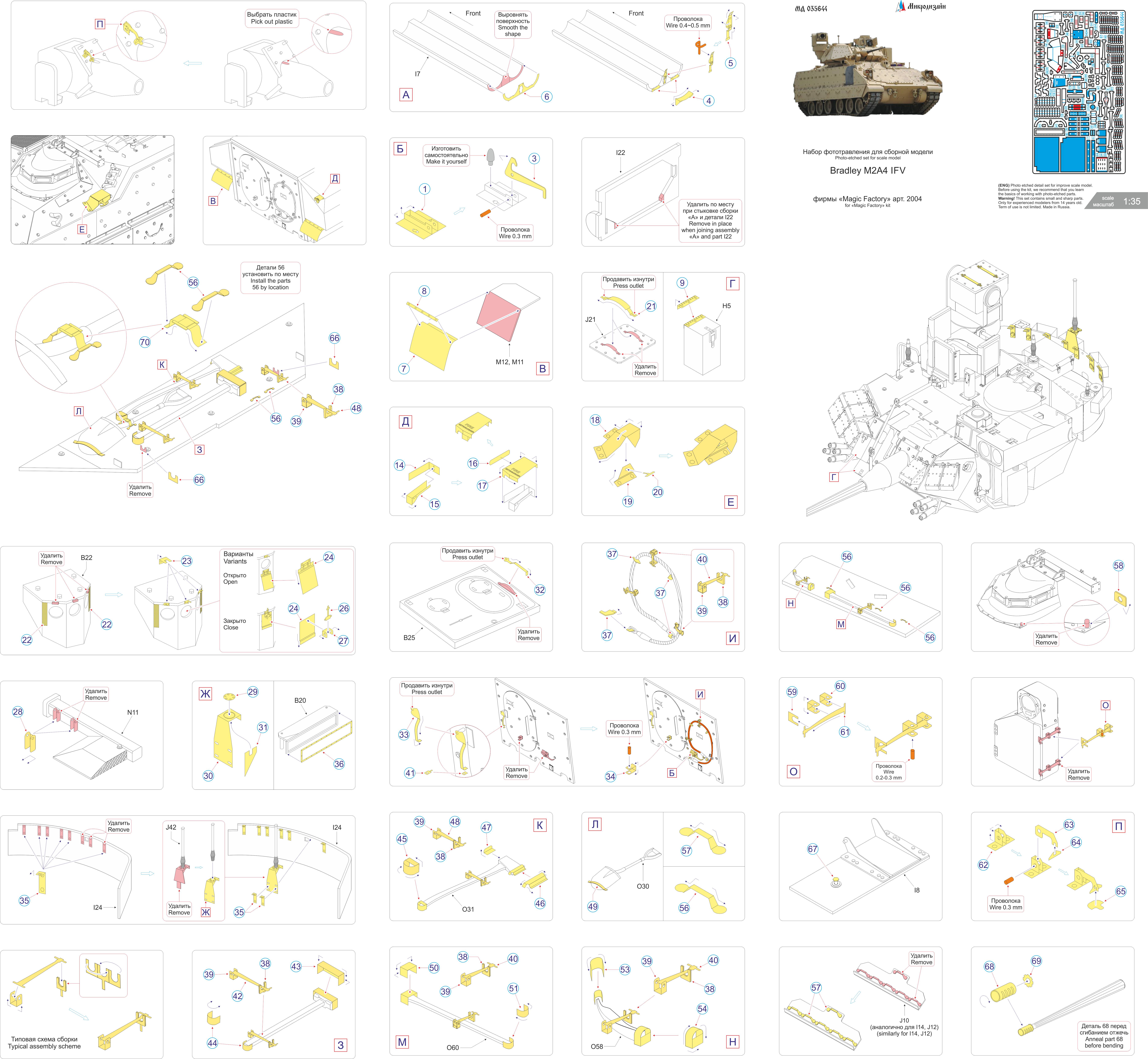 МД 035644 Набор фототравления на Bradley M2A4 IFV от Magic Factory. Масштаб 1:35. Материал: латунь 0,15 мм. Набор комплектуется платой фототравления и цветной инструкцией. Количество уникальных деталей: 63. Уровень сложности - средний.
