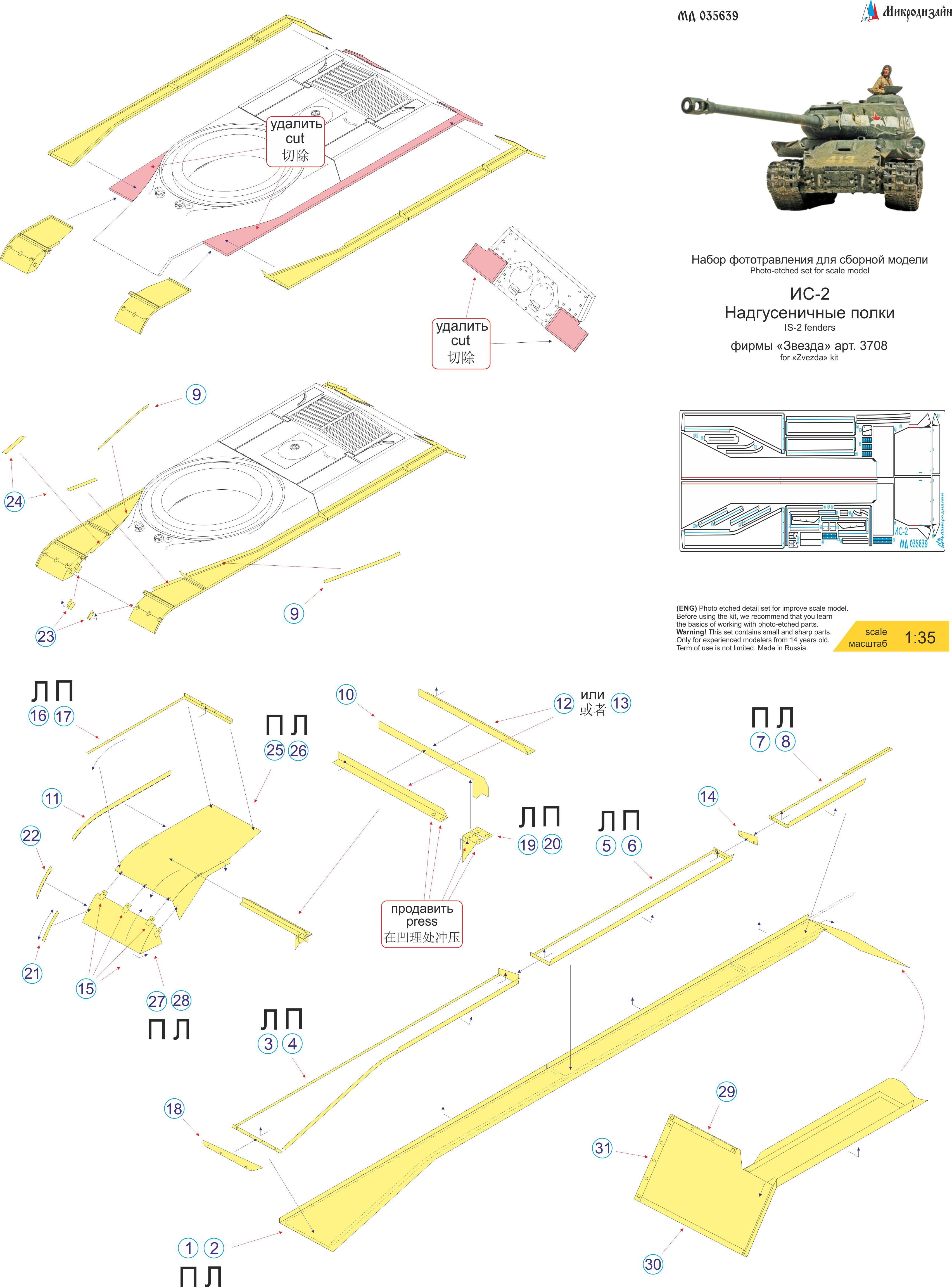 МД 035639 Набор фототравления надгусеничных полок на ИС-2 от Звезды. Масштаб 1:35. Материал: латунь 0,15 мм. Набор комплектуется платой фототравления и цветной инструкцией. Количество уникальных деталей: 31. Уровень сложности - средний.