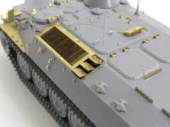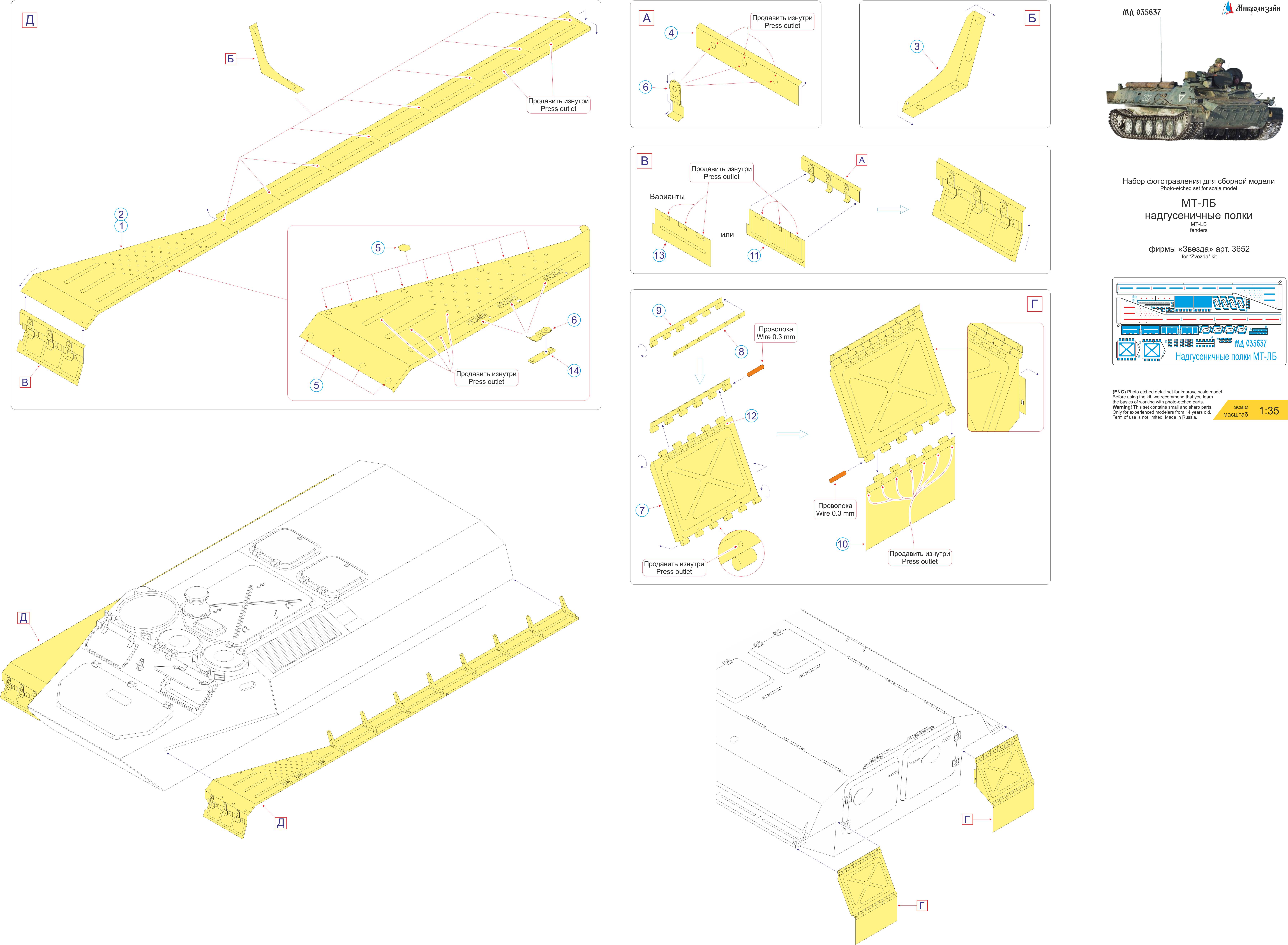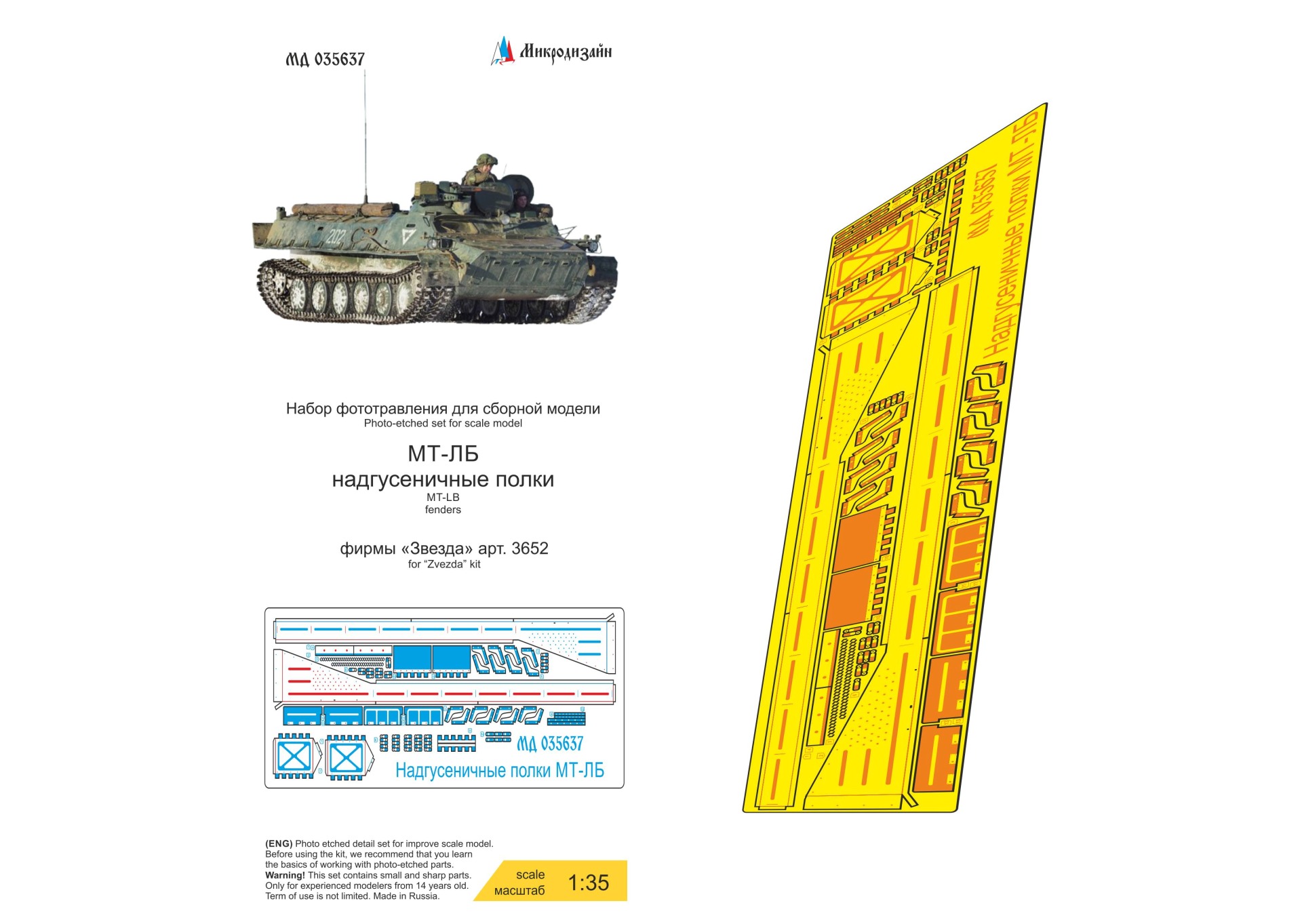 МД 035637 Набор фототравления надгусеничных полок МТ-ЛБ от Звезды. Масштаб 1:35. Материал: латунь 0,15 мм. Набор комплектуется платой фототравления и цветной инструкцией. Количество уникальных деталей: 12. Уровень сложности - средний.