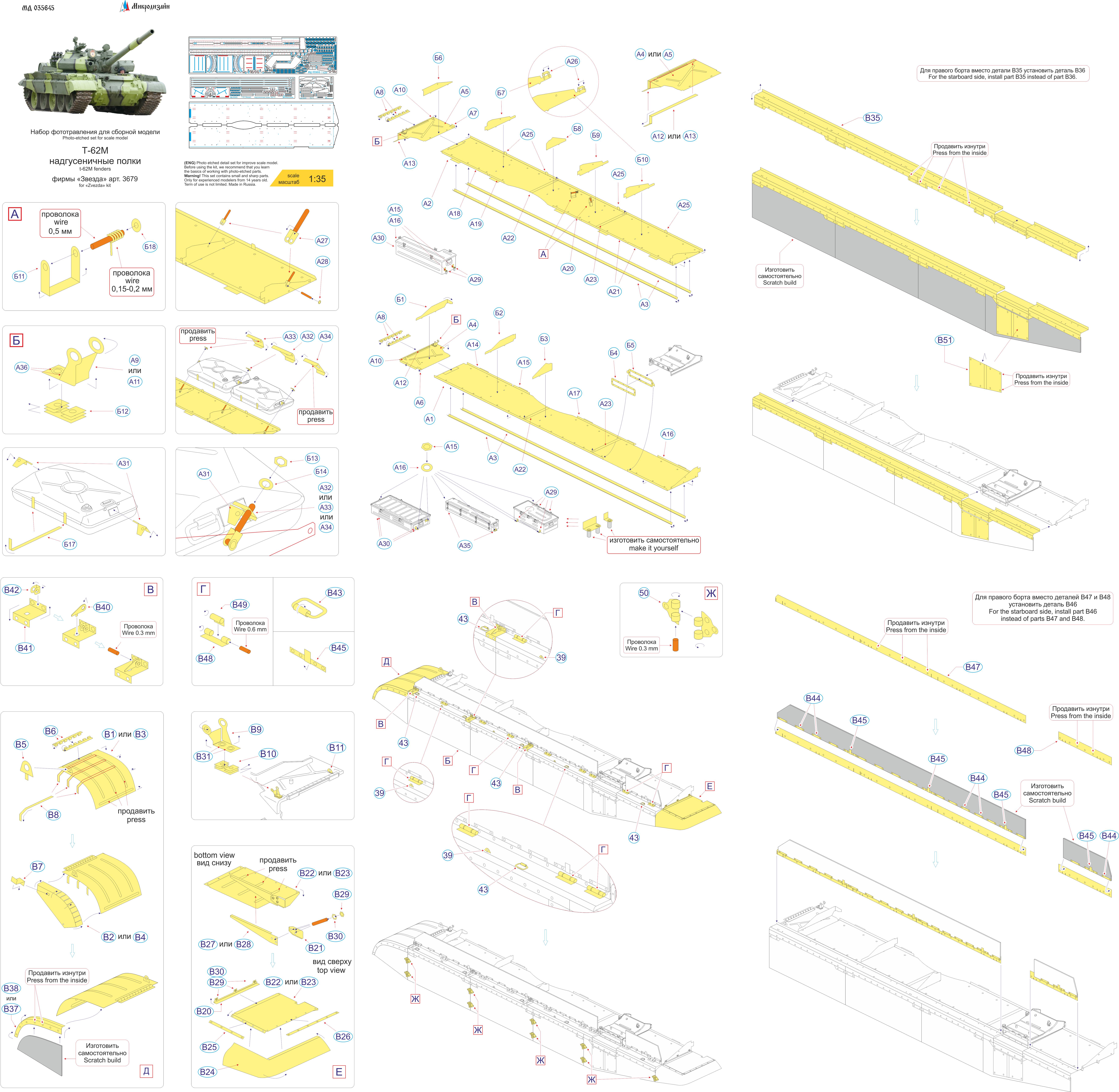 МД 035645 Набор фототравления надгусеничных полок на Т-62М от Звезды. Масштаб 1:35. Материал: латунь 0,2 мм и 0,15 мм. Набор комплектуется 4 платами фототравления и цветной инструкцией. Количество уникальных деталей: 48. Уровень сложности - выше среднего.