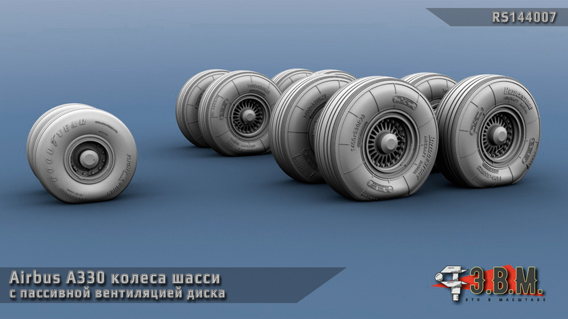 Колеса шасси для модели пассажирского авиалайнера Airbus A330 с пассивной вентиляцией дисков.