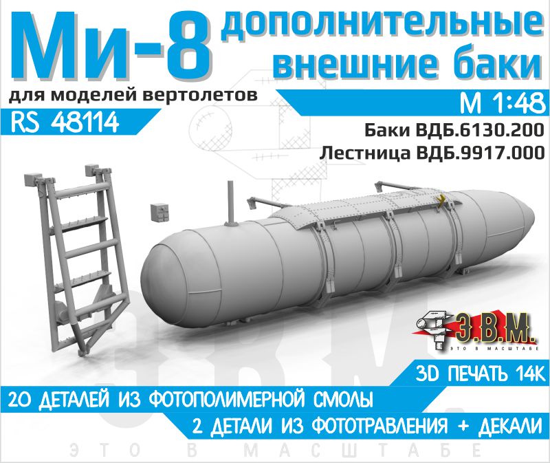 Набор дополнительного оборудования для вертолета МИ-8 - внешних дополнительных топливных баков типа ВДБ 6130.200. К ним также лестница ВДБ 9917.000 для завправки баков в сложенном виде и индикатор ВДБ в кабину.