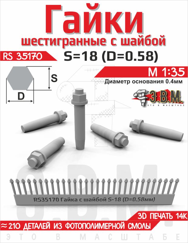 RS35170 Гайка шестигранная с шайбой S=18 (D=0,58) мм. Посадочный D=0,4 мм. М1:35