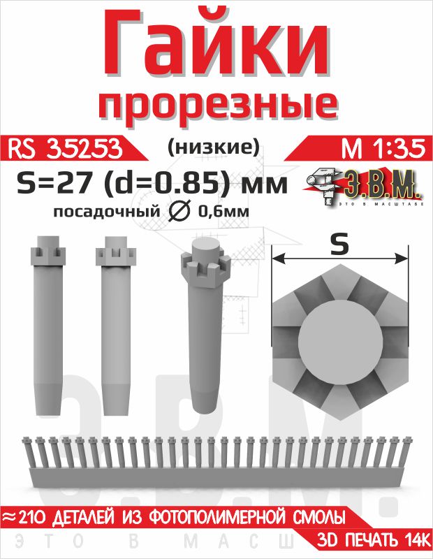 RS35253 Гайка прорезная низкая, S=27 (D=0,85) мм. Посадочный D=0,6 мм. М1:35