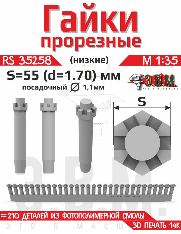 RS35258 Гайка прорезная низкая, S=55 (D=1,7) мм. Посадочный D=1,1 мм. М1:35