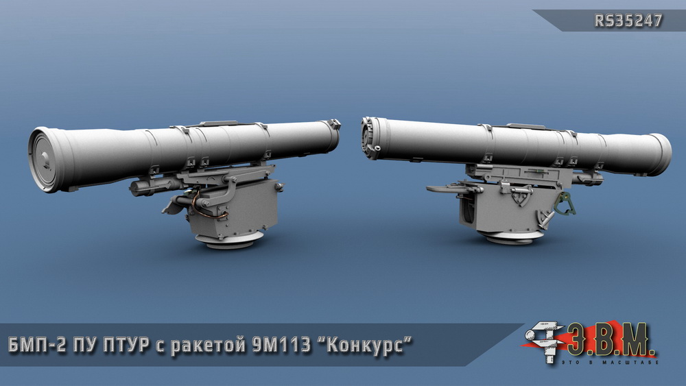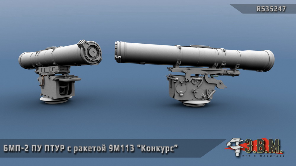 Пусковая установка ПТУР с транспортно-пусковым контейнером ракеты 9М113 «Конкурс» для модели БМП-2 в масштабе 1:35.