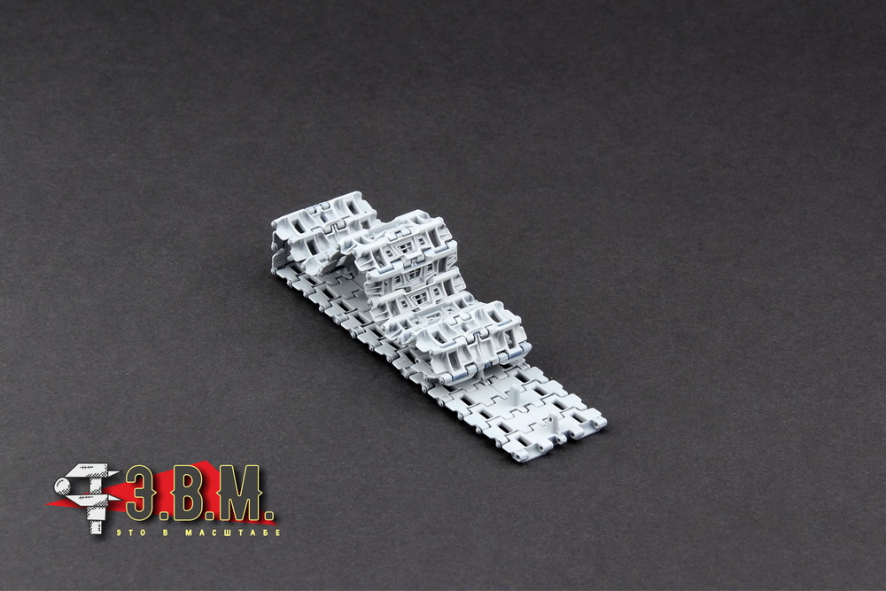 Траки с высокой степенью детализации передают все нюансы конструкции, имеют полый гребень, гарантированно подходят к ведущим колесам из набора "Звезды", надежно и просто собираются в подвижную гусеницу, достаточно прочную, способную выдерживать нагрузку в несколько кг.